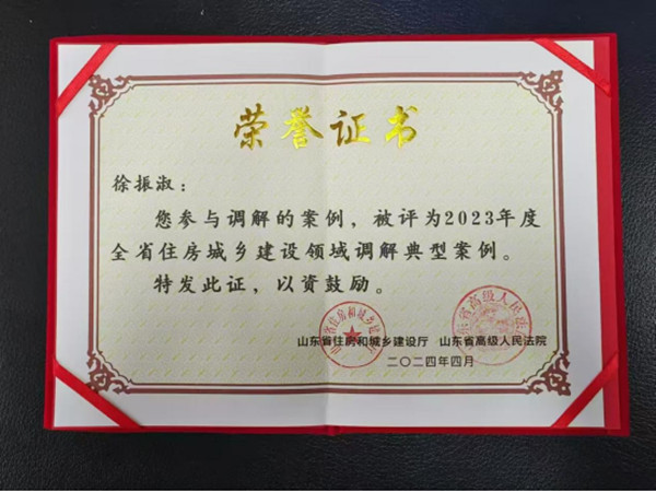 在交流发言环节,胡建新主任将山东德与法调解团队情况、办理的调解案件情况在本次会议上予以通报。近年来,山东德与法律师事务所积极参加社会矛盾的化解工作,办理了多起具有典型意义的调解案例:其中一个案例,被山东省高级人民法院和省工商联联合评选为2023年度全省十大典型案例;一个案例被山东省住房和建设厅、山东省高级人民法院联合评选为2023年度全省住房城乡建设领域调解典型案例;一个案例被山东省总工会评选为全省2024年度维护农民工权益典型案例。